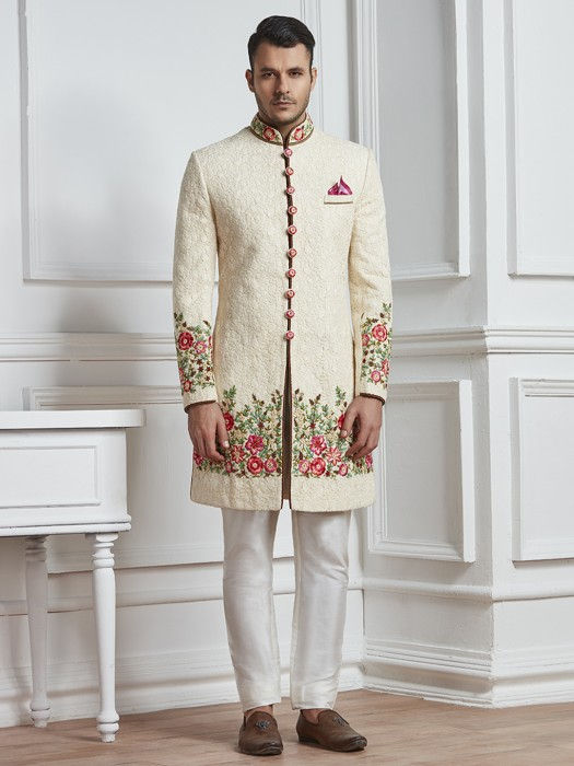 CREAM AND PEACH SILK SHERWANI